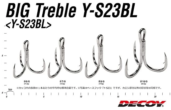 Der „Decoy Big Treble Y-23BL“ ist eine spezielle Spezifikation, die darauf abzielt, die Überlebensrate der gefangenen Fische bei der Catch-and-Release-Angelpraxis für seltene Game-Fische wie GT (Riesenmakrele) und Gelbflossenthun zu erhöhen, indem der Widerhaken (Barb) entfernt wird. Es handelt sich nicht nur um einen einfachen barbless Haken, sondern um den „MAGIC BARBLESS“, der eine höhere Durchdringungsleistung als ein Haken mit Widerhaken aufweist und weniger wahrscheinlich ausfällt als ein barbless Haken. Durch die Einführung einer geringfügigen Stufe wird das Herausrutschen bei Spannungsverlust reduziert und gleichzeitig eine Eindringtiefe erreicht, die der eines barbless Hakens entspricht. Beim Landen ist ein schnelles und reibungsloses Lösen des Hakens möglich. Die Grundleistung entspricht der des Y-S23.