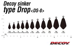Das „Decoy Sinker Type Drop DS-8“ ist ein sechsseitig abgeflachtes Senkblei mit ausgezeichneter Bodenerkennungsfähigkeit und verhedderungsfreien Eigenschaften. Durch seine Form ist es weniger wahrscheinlich, dass es beim Einhaken stört, wodurch der Zero-Dan-Bereich weiter vergrößert wird. Darüber hinaus ist es auch für Offshore-Games geeignet.