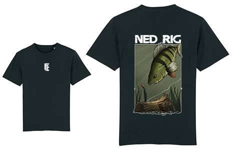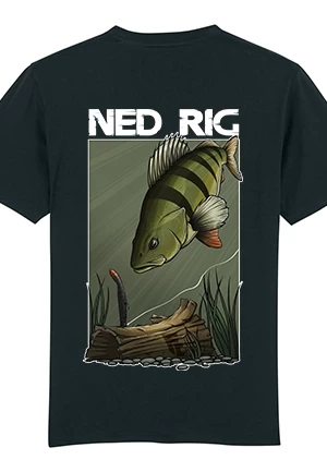 Auf dem Rücken befindet sich das NedRig mit einem Nikko Zaza Leech & einem Barsch, welcher durch Transferdruck auf das T-Shirt aufgebracht wurde.