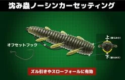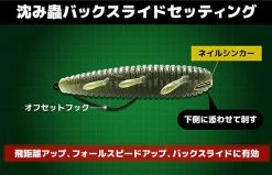 Der „Issei Shizumi Mushi“ ist ein einfacher und explosiver Wurm. Das hochdichte Material und der stromlinienförmige Körper sorgen für eine erstaunliche Flugweite. Setze den Haken von der dünnen Seite des Körpers aus. Ohne zusätzliches Gewicht fällt der Köder horizontal in der Wassersäule, während er seine Beine bewegt. Wenn du einen Nailsinker an der dickeren Seite des Körpers anbringst, kannst du den Köder als Back-Slide-Rig fischen.
