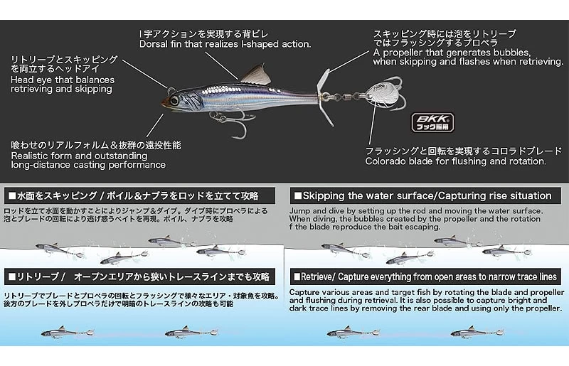 Mit einem realistischen Körper und einem an der Rückseite montierten Propeller, ermöglicht der „Little Jack Segrock 78mm“ durch Flackern und Vibrationen die Ansprache eines breiteren Spektrums an Zielen. Zudem sorgt das am hinteren Haken befestigte Colorado-Blade für eine hervorragende Anziehungskraft. Mit verschiedenen Aktionen wie Einholen oder Skipping kannst du diverse Situationen erfolgreich meistern. Durch einfaches Einholen erzeugt die Kombination aus Propeller und Blade eine doppelte Flackeraktion, die kraftvoll auf ein größeres Zielgebiet wirkt. Durch die Nutzung der Skipping-Aktion, bei der der Köder über die Wasseroberfläche springt, wird er von Blasen umgeben und kann besonders effektiv auf schwimmende Fische oder beim Anvisieren von Fischschwärmen wirken.