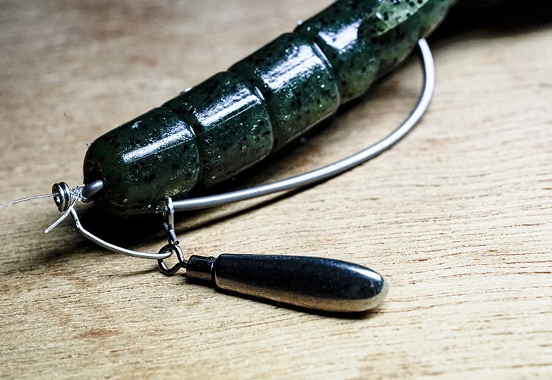 Die Glide Hanger werden auf das Vorfach, sowie den Offsethaken gezogen. Das Gewicht hat mit Hilfe der Glide Hanger mehr Spiel und verleiht dem Köder einen anderen Lauf.