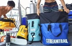 Das Mero-0 Bag der Marke StreamTrail besteht aus hochwasserdichtem Planenmaterial (Polyester) und hält viel Stauraum bereit, der beim Tragen von sperrigem Gepäck wie Tauchausrüstung und Campingausrüstung nützlich ist. Das Bag hat einen Seitengriff, der bequem auch für das Tragen von schwerem Tackle geeignet ist und einen seitlichen Abflussstopfen, der angesammeltes Wasser ableitet, wenn nasse Dinge hineingelegt wurden.