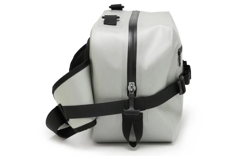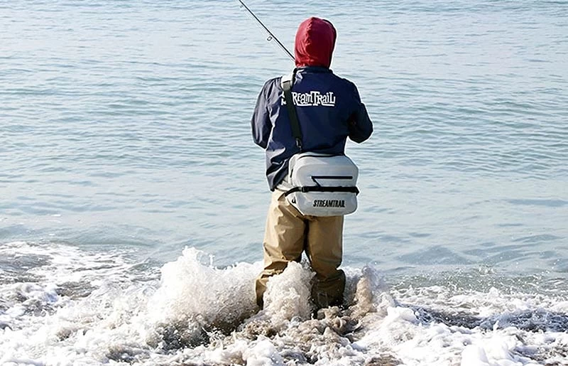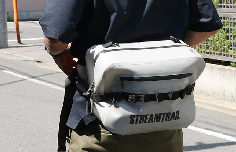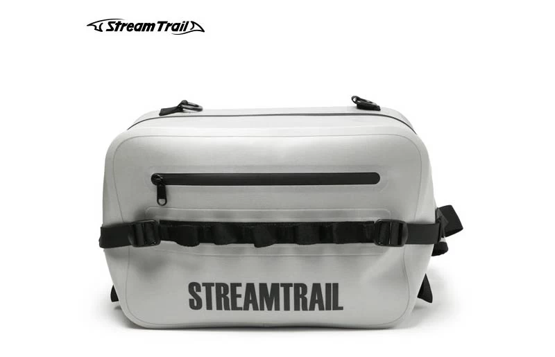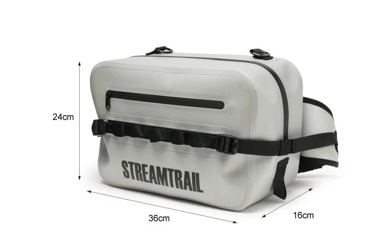Der „Stream Trail Stormy HipPack“ ist ein geräumiger Hüftbeutel mit einem Volumen von ca. 13 Litern und einem Gewicht von etwa 900 g. Er verfügt über einen vollständig wasserdichten Reißverschluss, der das Eindringen von Wasser verhindert und kann mit einem Unterstützungsgurt sicher befestigt werden. An der Unterseite befindet sich ein Halter, an dem bei Bedarf Riemen angebracht werden können, um verschiedene Gegenstände zu befestigen. Der mitgelieferte Schultergurt kann verwendet werden, um die Tasche an der Vorderseite des Körpers zu tragen und gleichzeitig als Nackenstütze zu dienen. Im Inneren der Tasche gibt es eine kleine Tasche sowie einen Klettverschluss für den optional erhältlichen Innenraum.