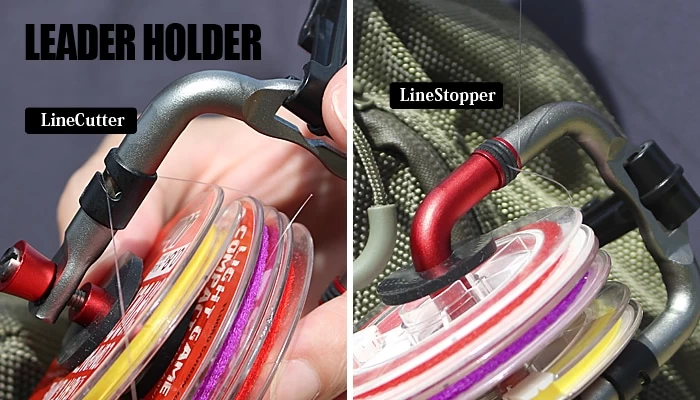 Ihr habt somit die Möglichkeit alle Vorfachstärken beisamen zu halten, und gleichzeitig ein nützliches Tool, mit denen sich das Nylon oder FC schneiden und festhalten lässt.